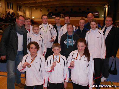 Was für ein Erfolg!!! - Das sächsische Team um den Landestrainer Manuel Meier konnte sich bei der Deutschen Meisterschaft Ende Januar 2014 gleich zwei Deutsche Vizemeistertitel und einen dritten Rang erkämpfen. Einen Vizemeistertitel sicherte sich der für unseren Verein startende Victor Haupt (1. Reihe Mitte).